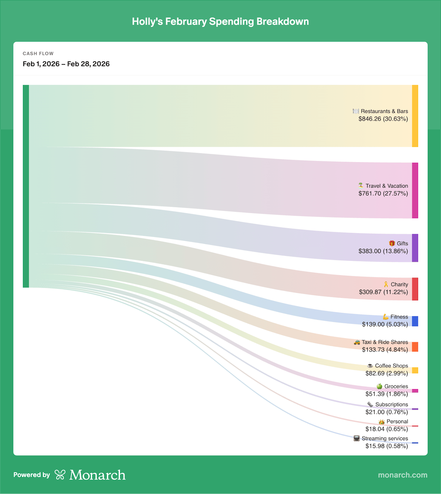 First, track your spending. This is crucial for identifying your spending patterns and weak points. We always recommend using a budgeting app like Monarch, because it makes this step a whole lot less agonizing. Monarch actually lets you create “rules” so that all of your spending is automatically categorized correctly. It even lets you split expenses if you, say, were venmoed for half of a dinner out, or bought both a bottle of wine and personal necessities on a grocery store run. It will also give you a detailed spending report (see example below) by category, so you can see exactly where your money has been going. Once you get in analysis mode, take note of what your common leaks are (such as food delivery, subscriptions, or impulse buys), and determine if you are living within your means or regularly outspending what you’re bringing in a given month.